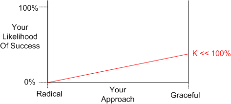 The more radical your idea, the more graceful you must be in your advocacy in order for the idea to have any chance of infiltrating the mainstream. If both your idea and your approach are radically extreme, then you’ll likely be perceived as a frontal assault idiot by not only those few in power, but those many on the front lines who would otherwise become your allies.