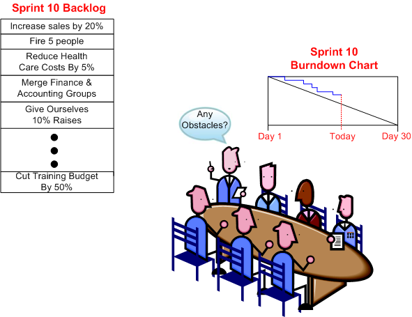In a brilliant marketing move to distance himself from his peers, Steve has jumped on the “agile” bandwagon. He’s been busy advocating the migration of Scrum out of the software development trenches; up the ladder and into the corner office we go. I can visualize it: CEO as Certified Product Owner, COO as Certified Scrum Master, and the rest of the C-suite as second-class, uncertified, “developers“. (Why is there no certification program for developers?)
