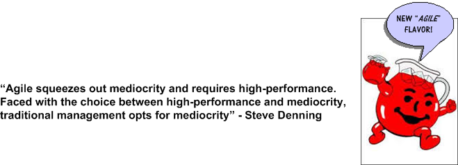 Steve Denning is a big-league business management guru, ala Gary Hamel, Tom Peters, Ken Blanchard, Bob Sutton, etc. Even though Mr. Denning has no software background, he somehow got into Jeff Sutherland’s refrigerator and managed to drink a whole pitcher of “agile” koolaid with nary a burp.