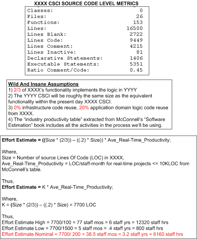 The figure below shows the derivation of an estimate of work in staff-hours to design/develop/test a Computer Software Configuration Item (CSCI) named YYYY. The estimate is based on the size of an existing CSCI named XXXX and the productivity numbers assigned to the “Real Time” category of software from the productivity chart in Steve McConnell‘s “Software Estimation: Demystifying the Black Art“.