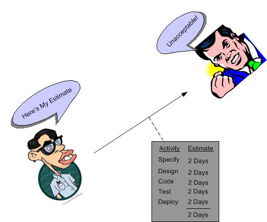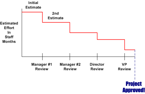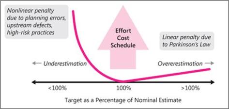 As you can see, the fiscal penalty for underestimation rockets out of control much quicker than the penalty for overestimation. In summary, once a project gets into “late” status, project teams engage in numerous activities that they don’t need to engage in if they overestimated the effort: more status meetings with execs, apologies, triaging of requirements, fixing bugs from quick-dirty workarounds implemented under schedule duress, postponing demos, pulling out of trade shows, more casual overtime, etc.
