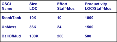 Ideally, for psuedo-accurate planning purposes, a software development org maintains its own table (see bogus example below) with real, measured numbers for the sizes of the CSCIs (Computer Software Configuration Items) that its DICs have created.
