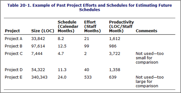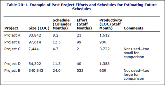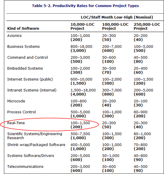 The Real-Time, 10K-100K LOC entry is circled because that’s the type and typical size of software that I specify/design/write. Note the huge 15-to-1 range of productivity for the type. Also note that the table contains large ranges of productivity for all the kind-size entries. Hint, hint: estimating is hard.