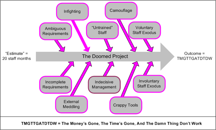 It’s no freakin’ wonder that the vast majority of software-intensive projects are underestimated, no? To add insult to injury, the unspoken pressure from the “upper layers” to underestimate the activities that ARE actually included in a project plan seals the deal for “perceived” future failure, no? It’s also no wonder that after a few years, good technical people who feel that hands-on creative work is their true calling start agonizing over whether to get the hell out of such a failure-inducing system and make the move on up into the world of politics, one-upsmanship, feigned collaboration, dubious accomplishment, and strategic self-censorship. Bummer for those people and the orgs they dwell in. Bummer for “the whole“.