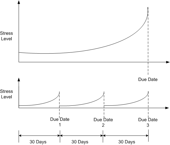 The figure below models the increase in team stress level versus time for waterfall and time-boxed projects. As a project nears a delivery date, the stress levels increase dramatically as the team fixes turds, integrates individually developed features into the whole, and takes care of the boring but important stuff that nobody wanted to do earlier.
