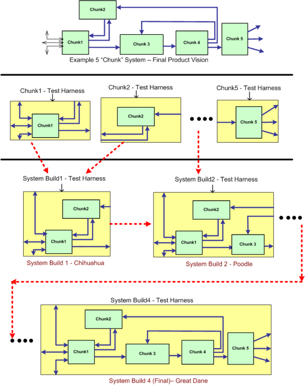 Follow the progression in the non-standard, ad-hoc diagram downward to better understand the process of incremental chunked development. It’s not much different than the classic “unit testing and continuous integration” concept. The real difference is in the size, granularity, complexity and automation-ability of the individual chunk and multi-chunk integration test harnesses that need to be co-developed. Often, these harnesses are as large and complex as the product’s chunks and subsystems themselves. Sadly, mostly due to pressure from STSJ management (most of whom have no software background, mysteriously forget repeated past schedule/cost performance shortfalls, and don’t have to get their hands dirty spending months building the contraption themselves), the effort to develop these test support entities is often underestimated as much as, if not more than, the product code. Bummer.