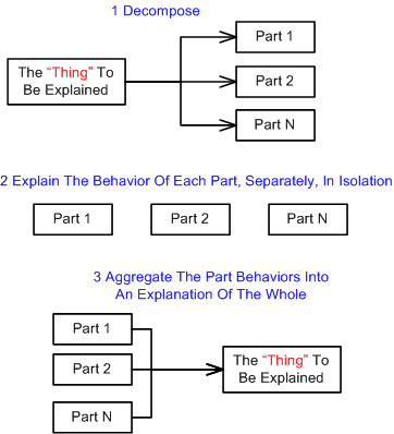 …Machine-Age thinking: (1) decomposition of that which is to be explained, (2) explanation of the behavior or properties of the parts taken separately, and (3) aggregating these explanations into an explanation of the whole. This third step, of course, is synthesis.