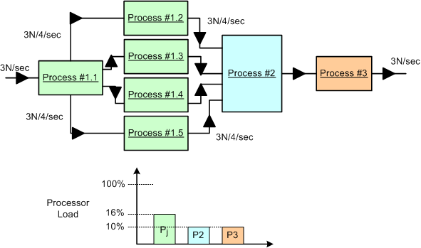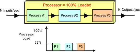 Assume that we have a data-centric, real-time product that: sucks in N raw samples/sec, does some fancy proprietary processing on the input stream, and outputs N value-added measurements/sec. Also assume that for N, the processor is 100% loaded and the load is equally consumed (33.3%) by three interconnected pipeline processes that crunch the data stream.
