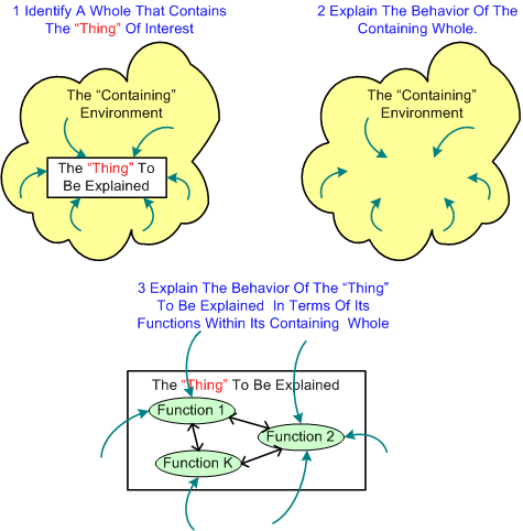 3. Then explain the behavior or properties of the thing to be explained in terms of its role(s) or function(s) within its containing whole.