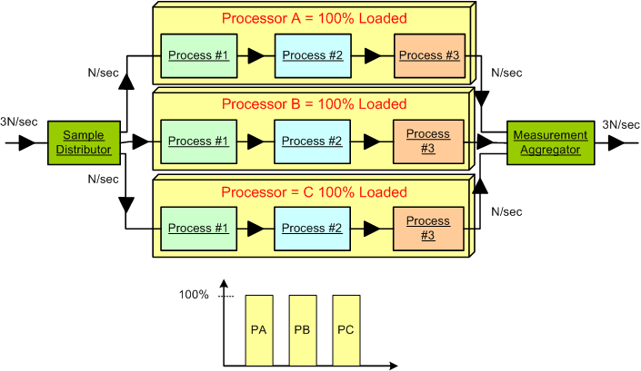 Next, assume that a new, emerging market demands a system that can handle 3*N input samples per second. The obvious solution is to employ a processor that is 3 times as fast as the legacy processor. Alternatively, (if the nature of the application allows it to be done) the input data stream can be split into thirds , the pipeline can be cloned into three parallel channels allocated to 3 processors, and the output streams can be aggregated together before final output. Both the distributor and the aggregator can be allocated to a fourth system processor or their own processors. The hardware costs would roughly quadruple, the system configuration and control logic would increase in complexity, but the product would theoretically solve the market’s problem and produce a new revenue stream for the org. Instead of four separate processor boxes, a single multi-core (>= 4 CPUs) box may do the trick.