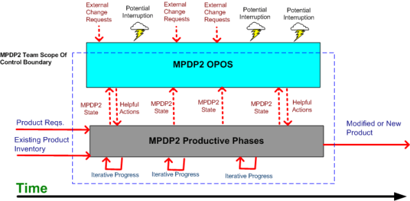 One of the MPDP2 activties, which stretches across and runs in parallel to the time sequenced development phases, is called OPOS = Ongoing Planning, Ongoing Steering. The figure below shows the OPOS activity gaz-intaz and gaz-outaz.