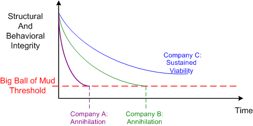 In the post delivery phase, as the (always) unheralded maintenance team starts adding new features without understanding the system’s limitations and bottlenecks, the structural and behavioral integrity of the beast starts surely degrading over time. Scarily, the rate of degradation is not constant; it’s more akin to an exponential trajectory. It doesn’t matter how pristine the original design is, it will undoubtedly start it’s march toward becoming an unlovable “big ball of mud“.