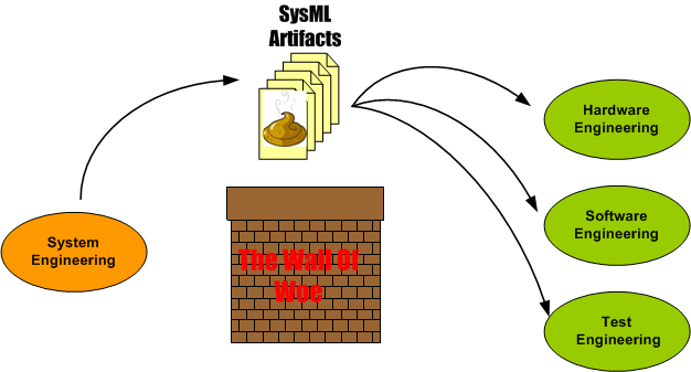 Armed with their new training, the system engineering team comes back, generates a bunch of crappy, incomplete, ambiguous, and unhelpful SysML artifacts, and then dumps them on the software, hardware, and test teams. The receiving teams, under the schedule gun and not having been trained to read SysML, ignore the artifacts (while pretending otherwise) and build an unmaintainable monstrosity that just barely works – at twice the cost they would would have spent if no SysML was used. The hierarchs, after comparing product development costs before and after SysML training, declare SysML as a failure and business returns to the same old, same old. Bummer.