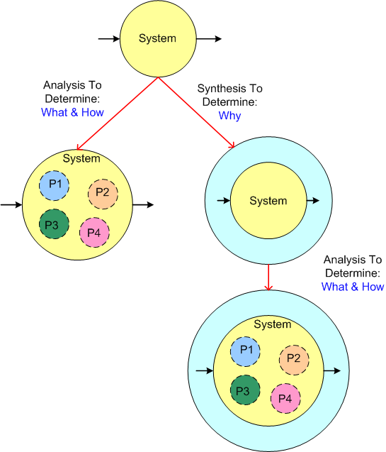A complementary approach to understanding a SOI concerns formulating the why of the system – first. As the right-side path in the above figure conveys, the synthesis approach to understanding starts with the exploration of the super-system that contains the SOI. Upon gaining an understanding of the operational context of the SOI within its parent system (the why), the what and the how of the SOI’s parts can be determined with greater accuracy and insight.