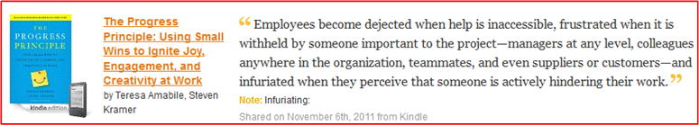 Of course, the best parts of Ms. Amabile book are when she exhibits many of the heartfelt entries written by real people from her massive stash of 12,000 diary entries. Read it and weep, or read it and leap for joy, or read it and “meh“.