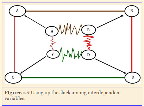 The diagram shows the slow, insidious erosion in flexibility that occurs in a complex system when efficiency and optimization initiatives are relentlessly applied to the system by its uninformed stewards. As the “slack” is stretched out of the system due to increasing internal pressure, it: 1) loses its robustness to external stressors, 2) the tension between connected nodes increases, and 3) the inter-node couplings harden. At the system breaking point, one or more of the connections crack open, the nodes fly apart, and the conglomeration ceases to function as a whole – a system. I hate when that happens!