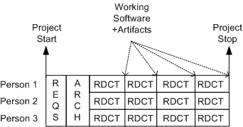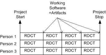 Moving on to a sunnier disposition, the template below shows a more “sane“, but not infallible, method of scheduling. It’s a model of the incremental “evo” strategy that I first stumbled upon from Tom Gilb – a bazillion years before the agile movement rose to prominence. In the evo(lutionary) approach, stable working software becomes visible early with each RDCT cycle and it grows and matures as the messy (it’s always messy) project lurches forward.