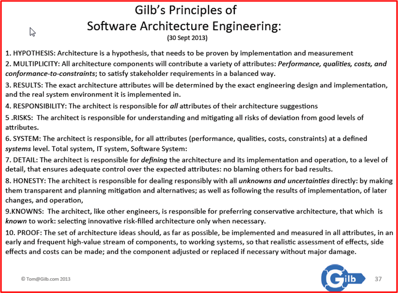Plucked from his deliciously titled “Real Architecture: Engineering or Pompous Bullshit?” slide deck, I give you Tom Gilb‘s personal principles of software architecture engineering:
