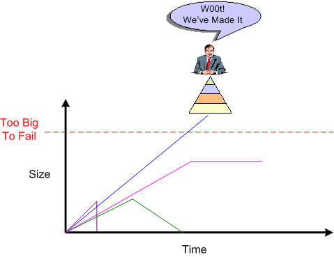 Did you ever wonder why companies are obsessed with growth? Check out the growth trajectories of four hypothetical companies below. Although company stewards may not explicitly state it, the goal of every for-profit enterprise is to become Too Big Too Fail (TBTF). At the moment the TBTF threshold is crossed, the risk of going bust disappears. Well, it doesn’t disappear, it simply gets transferred from the TBTF menace itself to the public via taxpayer bailouts by politicians who love to play with other people’s money – yours and mine.