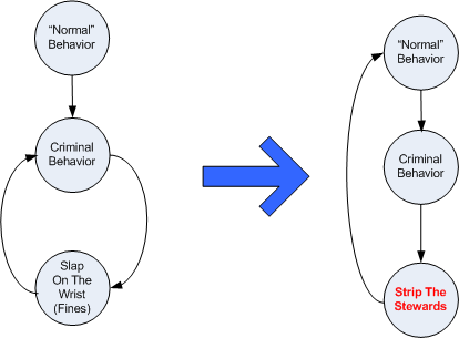 As the figure below illustrates, a “strip the stewards” punishment policy may not inhibit future normal-to-criminal behavior transitions after a reset to normal behavior, but it has a better chance of doing so than the current slap-on-the-wrist policy. What do you think can work?