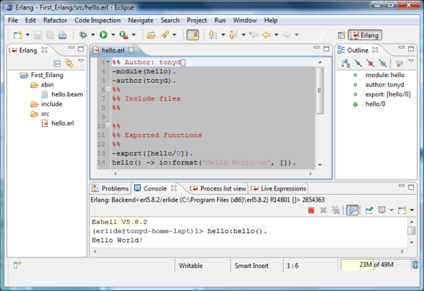 As you can see, the editor is showing the content of the “hello.erl” source code file, which contains the definition of the “hello/0” function. The console view at the bottom of the screen shows the result of manually typing in “hello:hello().“, which runs the program on the version 5.8.2 Erlang virtual machine (VM). Upon completion, the VM did what it was told. It printed, duh, : “Hello World!”.