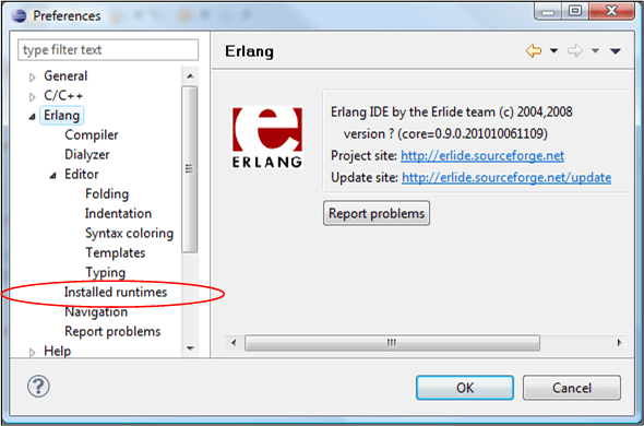 The snapshot below shows the configurability options offered up by Erlide via the eclipse “Preferences” window. I won’t go into the details here, but the “Installed runtimes” option is where you connect up Erlide with your installed Erlang VM(s).
