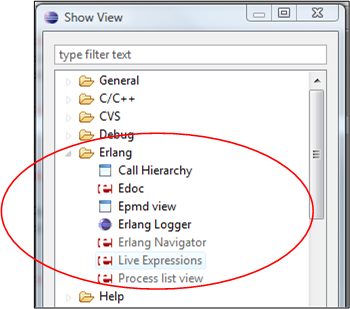 The complete list of Erlide views available to aspiring Erlang programmers is shown below. Since I’m a newbie to the land of Erlang, I have no freakin’ idea what they do yet.