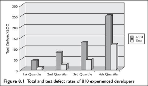 According to this performance chart, the best software developers (those in the first quartile of the distribution) “injected” on average less than 50 bugs (Watts calls them defects) per 1000 lines of code over the entire development effort and less than 10 per 1000 lines of code during testing. Assuming that the numbers objectively and fairly represent “reality“, the difference in quality between the top 25% and bottom 25% of this specific developer sample is approximately a factor of 250/50 = 5.