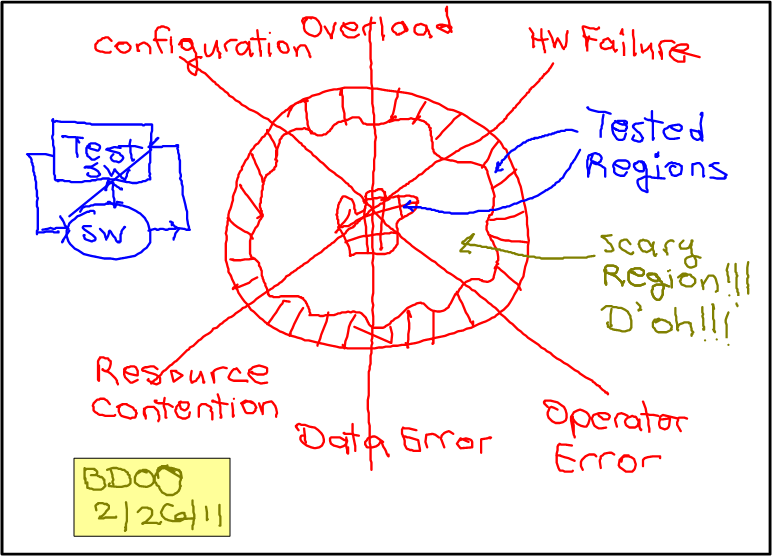 The point I’d like to make, which is different than the one Humphrey/Over focus on in their book (to sell their heavyweight PSP/TSP methodology, of course), is that when a software system is released into the wild, it most likely hasn’t been tested in the wacky configurations and states that can cause massive financial loss and/or personal injury. You know, those “stressful” system states on the edge of chaos where transient input overloads occur, or hardware failures occur, or corrupted data enters the system. I think building the test infrastructure that can duplicate these doomsday scenarios – and then actually testing how the system responds in these rare but possible environments is far more effective than just adding political dog-and-pony reviews/inspections to one’s approach to quality. Instead of decreasing the risk for a fixed TU ratio, which reviews/inspections can achieve (if (and it’s a big if) they’re done right), it increases the TU ratio itself. However, since system-specific test tools are unglamorous and perceived as unnecessary costs by scrooge managers more concerned about their image than other stakeholders, scarily untested software is foisted upon the populace at an increasing rate. D’oh!