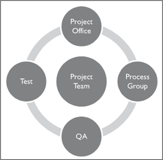In their book, “Leadership, Teamwork, and Trust: Building a Competitive Software Capability“, Watts Humphrey and James Over model a typical software project system via the diagram below (note that they have separate Quality Assurance and Test groups and they put the “project office” on top).