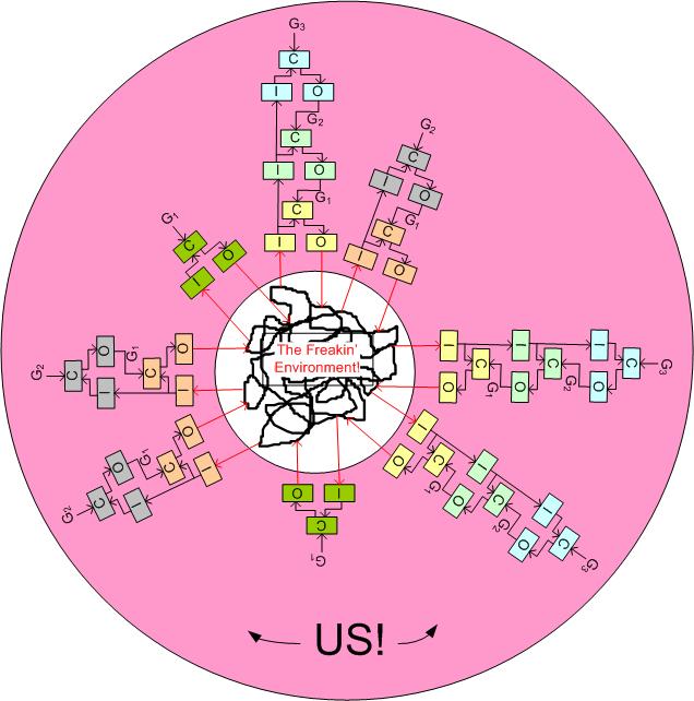 On the other hand, if our little autonomous control system is embedded within a larger hierarchical control system, then the goal of the parent system decision maker takes precedence over the goal of the child decision maker. In the eyes of its parent, the child decision maker is the parent’s very own virtual production subsystem be-otch.