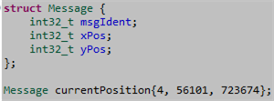 The following C++14 code fragment represents a general message layout along with a specific instantiation of that message: